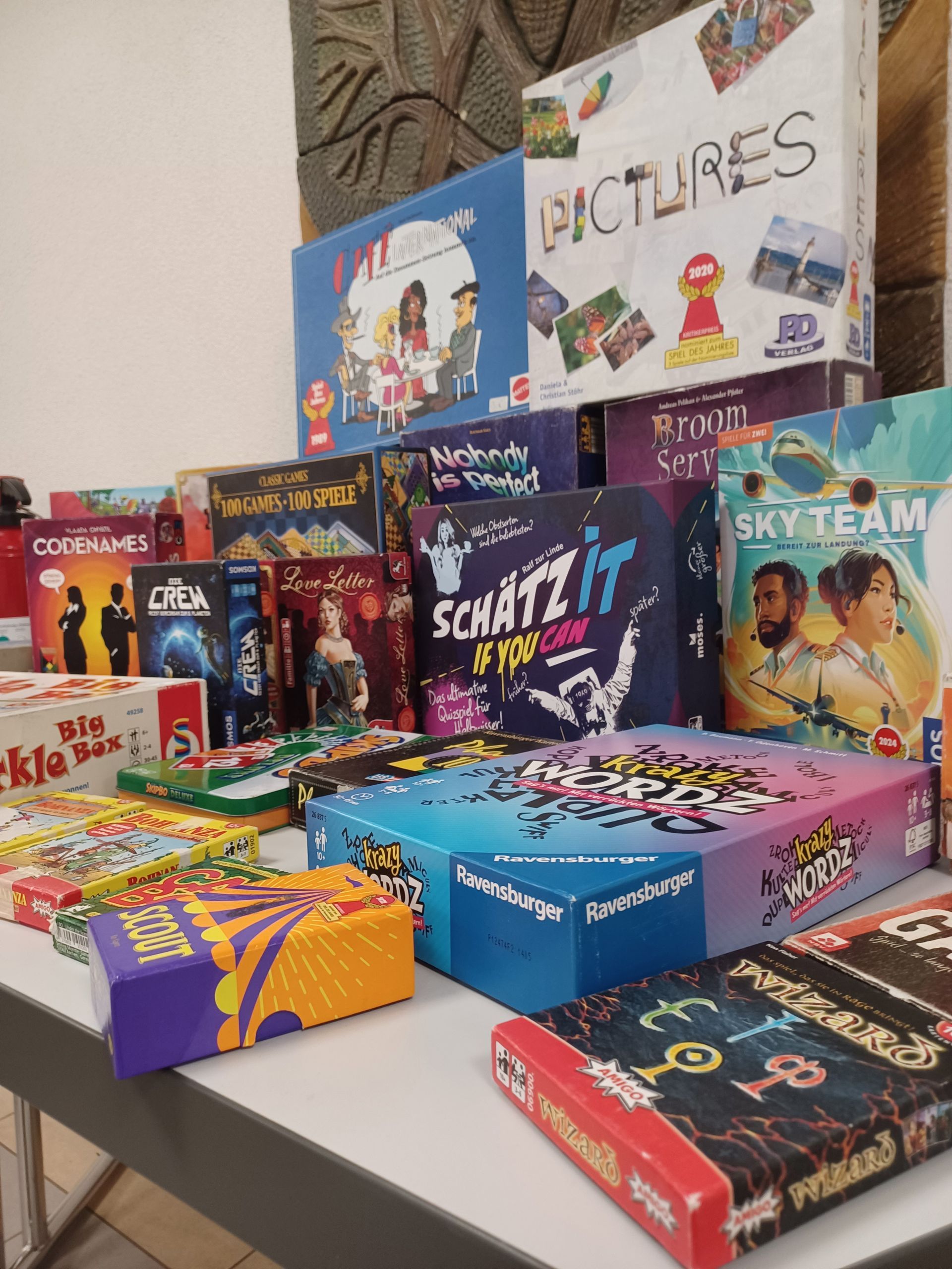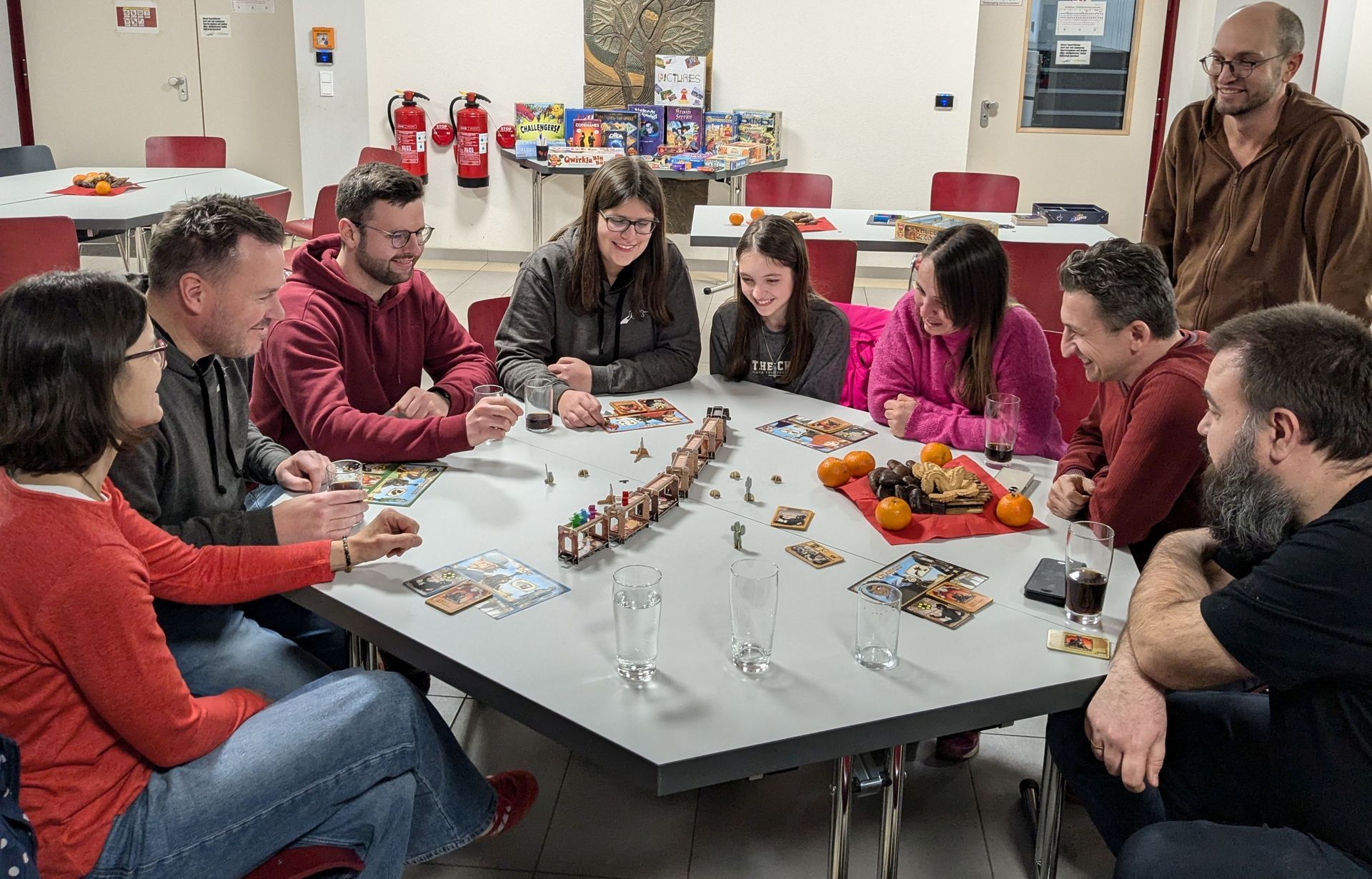 Zehn Spielebegeisterte, 40 Brett-, Würfel- und Kartenspiele, Getränke und Snacks, so startete der erste Spieleabend „Maifeld spielt“ des Ju+X-Teams der Verbandsgemeinde Maifeld am Montag, den 16.12.2024 im Foyer der Maifeldhalle in Polch.