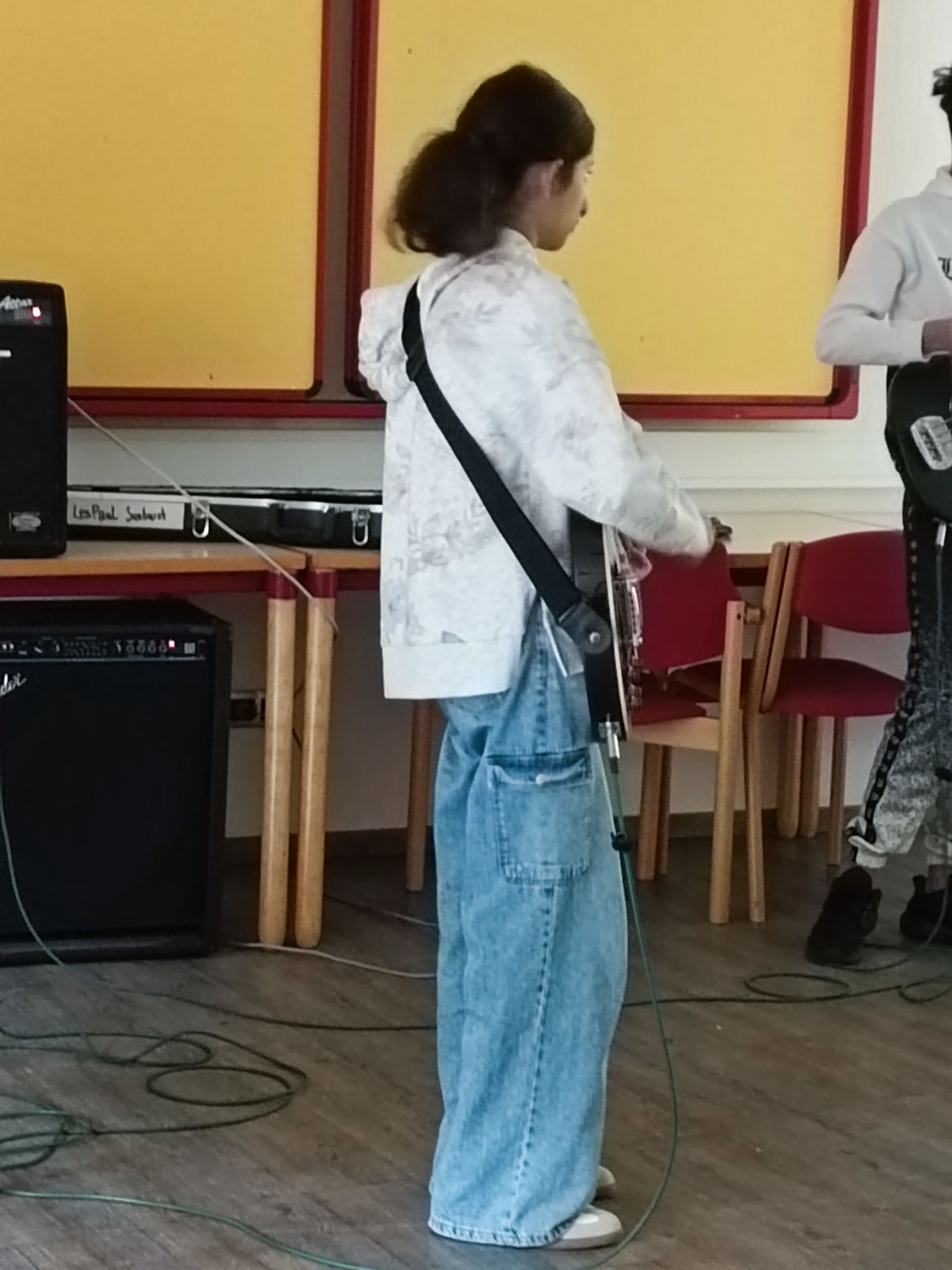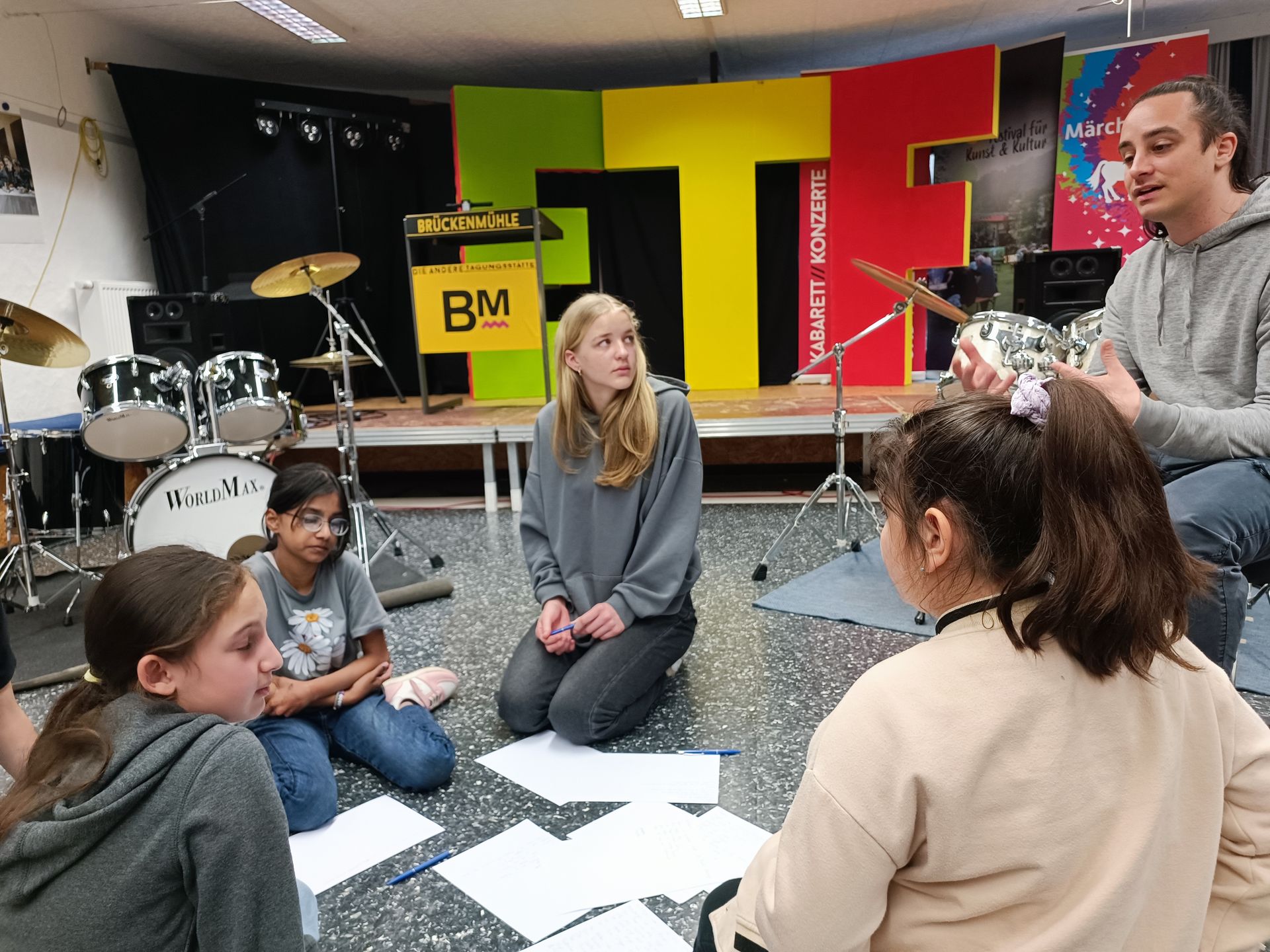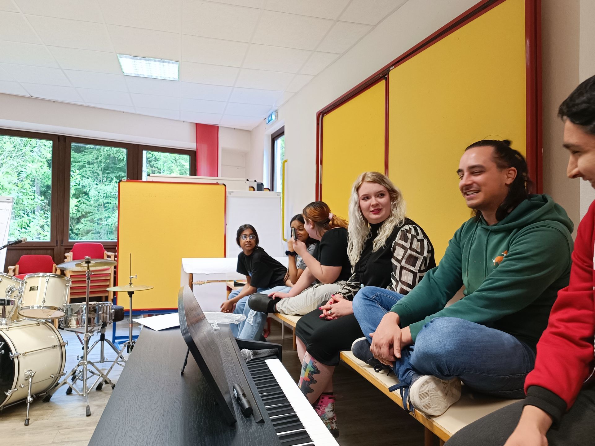 Die Brückenmühle bot dafür den perfekten Rahmen: Zwischen musikalischen Proberäumen, einer Freizeitlounge, einer großen Wiese für Außenaktivitäten, gemeinsamen Spielen und Mahlzeiten entstand schnell ein Gemeinschaftsgefühl, das sich auch in der Musik widerspiegelte. Unterstützt wurden die Jugendlichen erneut durch die Dozent:innen Nicolas, Paul und Miranda, die das Projekt mit viel Herzblut begleiteten und den jungen Menschen beim Texten eigener Zeilen, beim Finden von Melodien und beim Mut, persönliche Inhalte in Songs zu verarbeiten, zur Seite standen. Alle drei verstanden es, die Jugendlichen ernst zu nehmen, sie zu fordern und gleichzeitig individuell zu fördern.