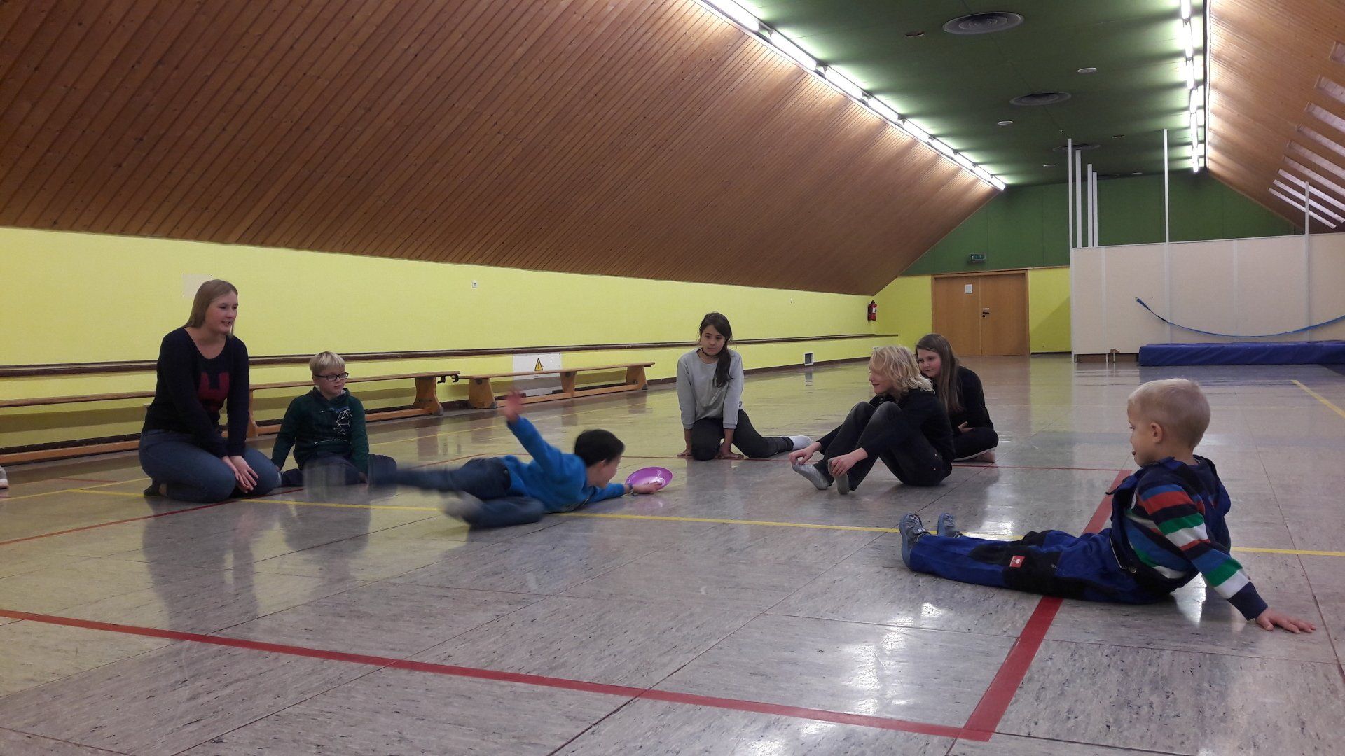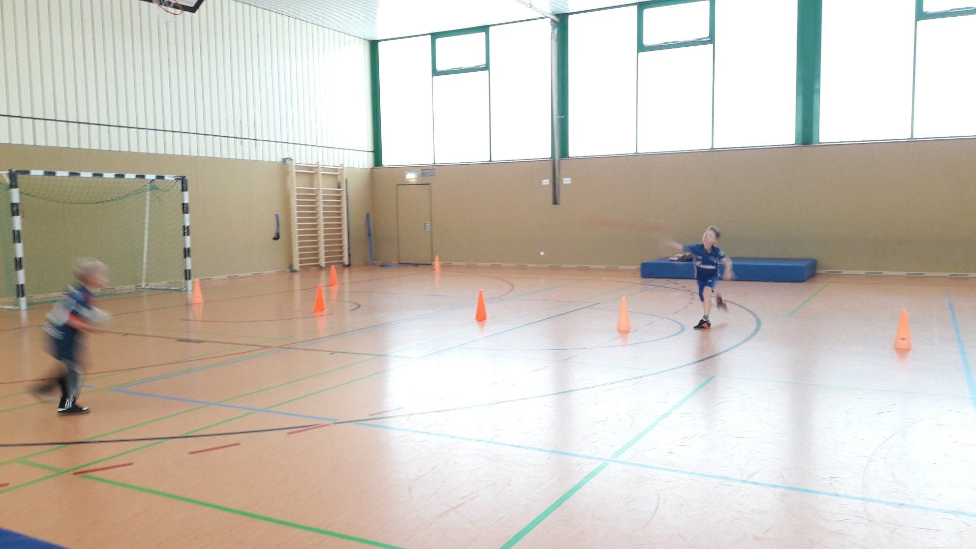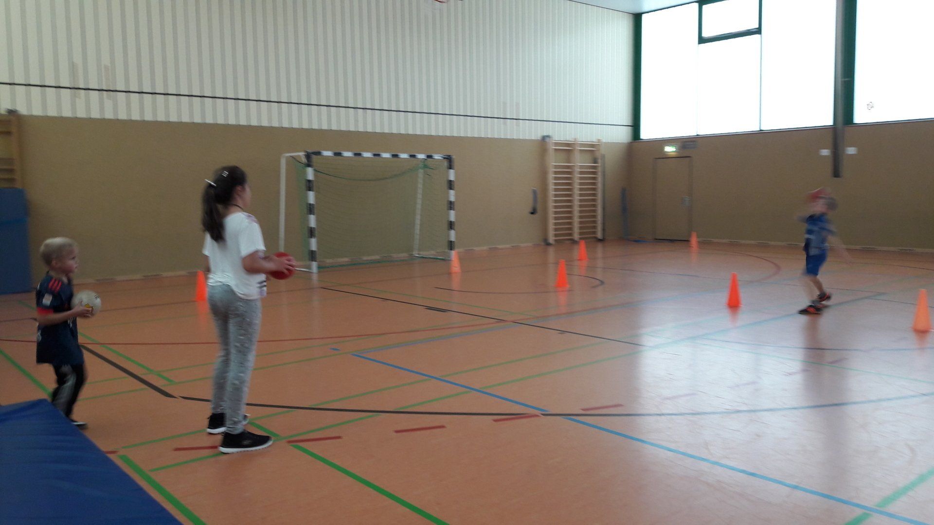 Um dem Bewegungsdrang der Kinder, trotz des ungemütlichen Wetters, gerecht zu werden, verbrachte die Gruppe auch viel Zeit in der Turnhalle, wo sie gemeinsame Bewegungsspiele spielte und verschiedene Sportarten ausprobierte.
