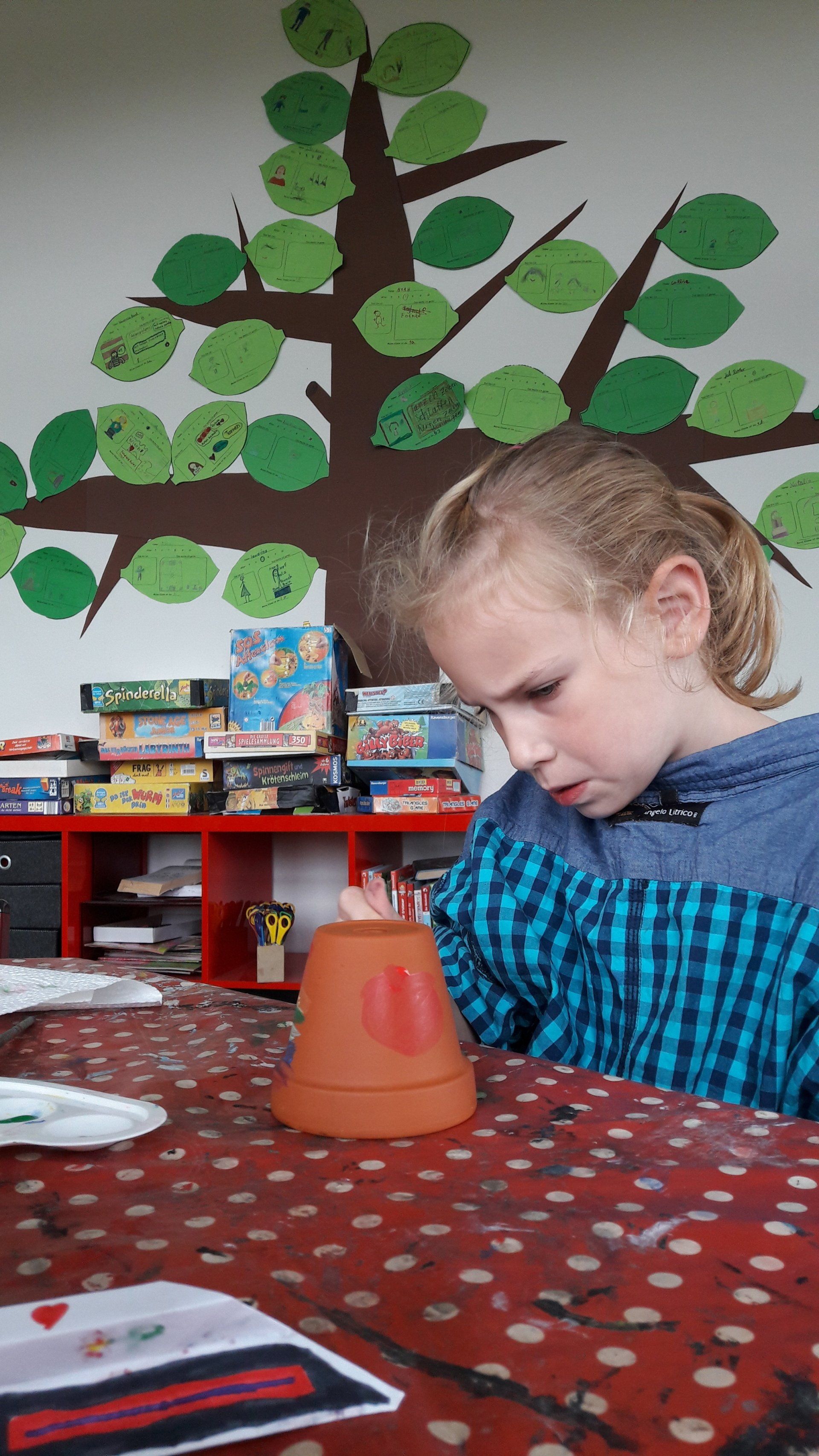 So bastelte die Gruppe beispielsweise in der ersten Woche dekorative Topfmännchen und backte herbstliche Drachenkekse. In der zweiten Woche gestalteten und befüllten die Kinder Blumentöpfe als Futterstation, um den Vögeln die Futtersuche im kalten Winter zu erleichtern. Darüber hinaus fanden die Kinder viel Freude am Gestalten von Bügelperlen.