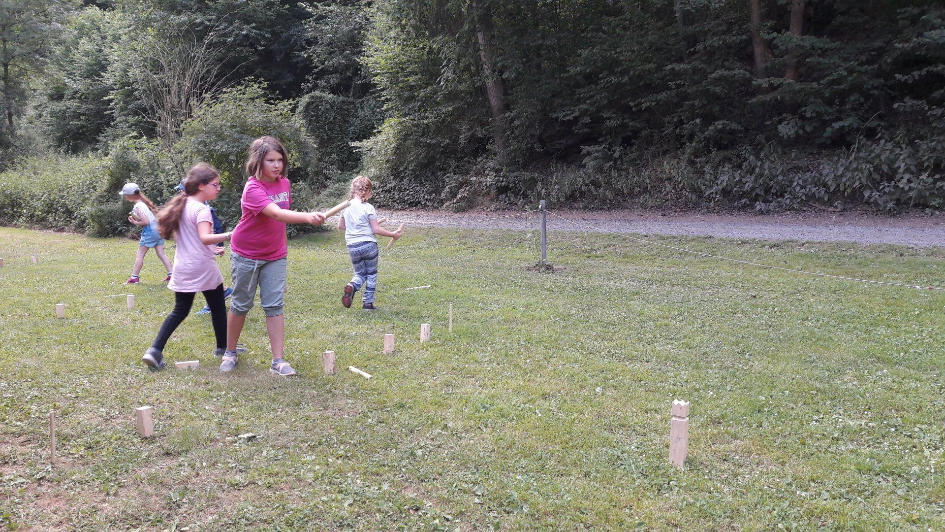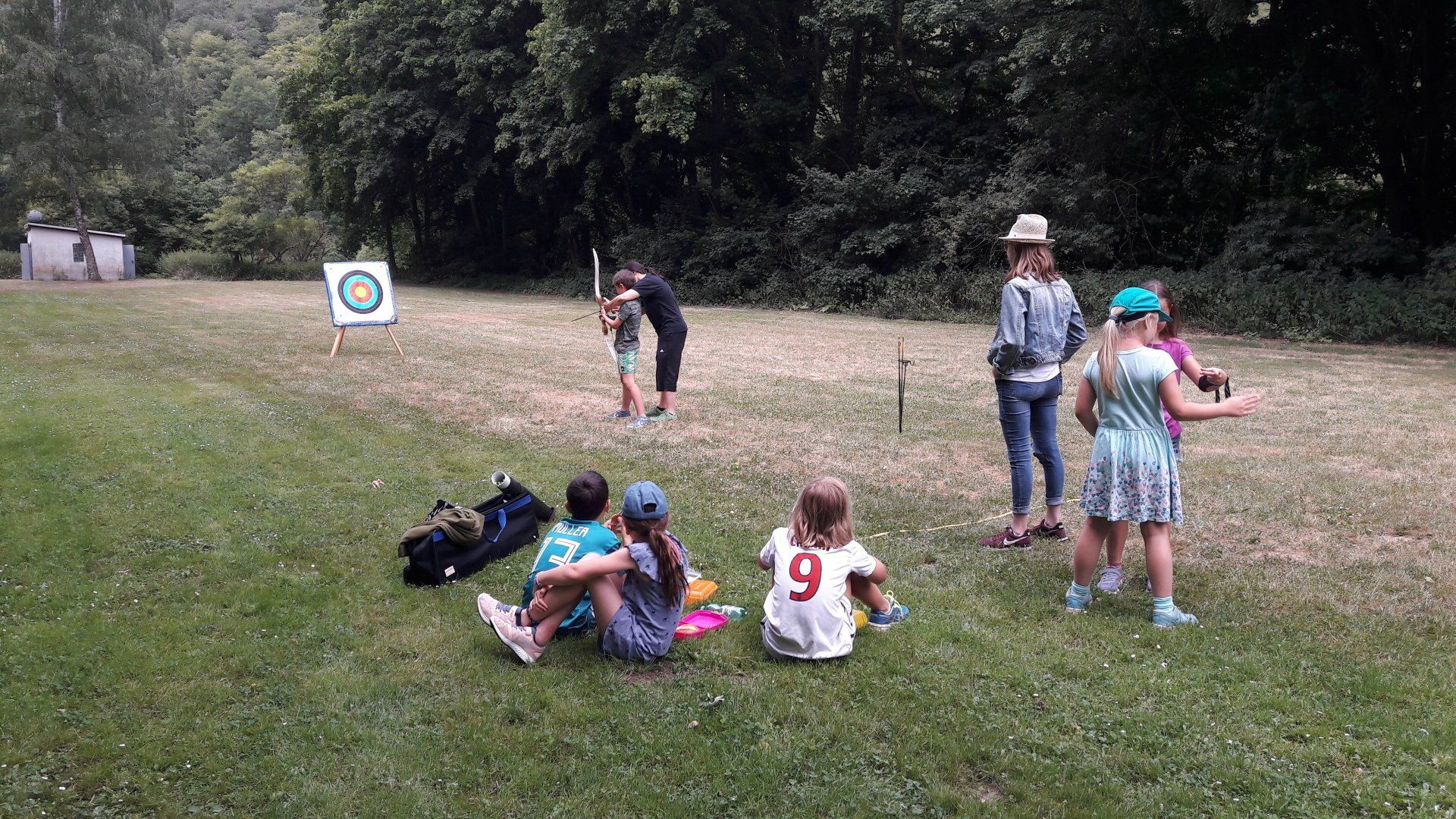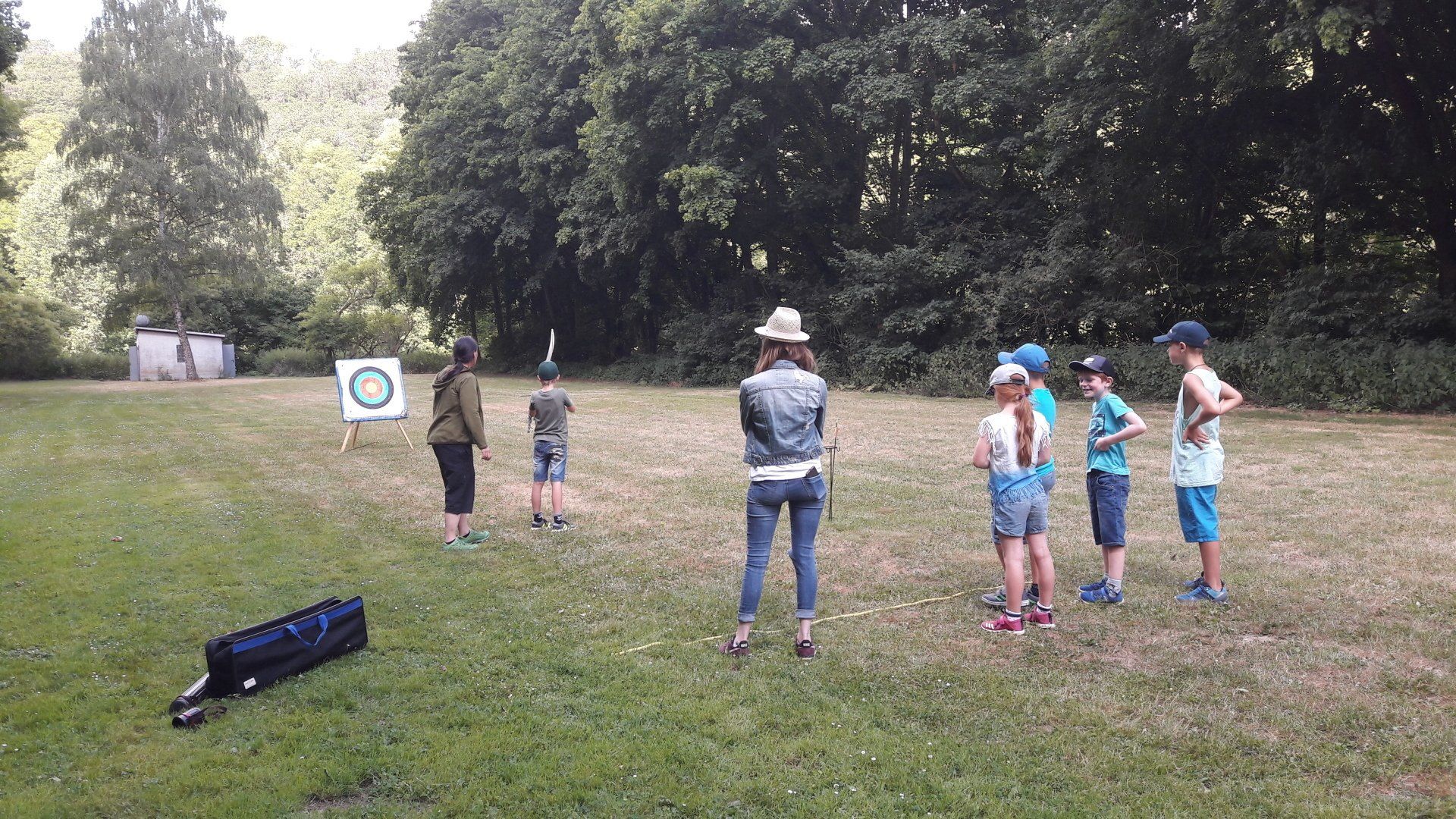 Darüber hinaus fand jede Woche eine kleine Wanderung zur Grillhütte in Ochtendung statt. Der Weg wurde dabei unterschiedlich gestaltet, sodass die Kinder durch verschiedenste Aufgaben und Spiele ihre Umgebung und die Natur ganz bewusst wahrnehmen konnten. Zum krönenden Abschluss wurde dann an der Grillhütte gespielt, gebadet und gegrillt. Besonders viel Spaß hatten die Kinder hier beim Bogen- und Armbrustschießen.